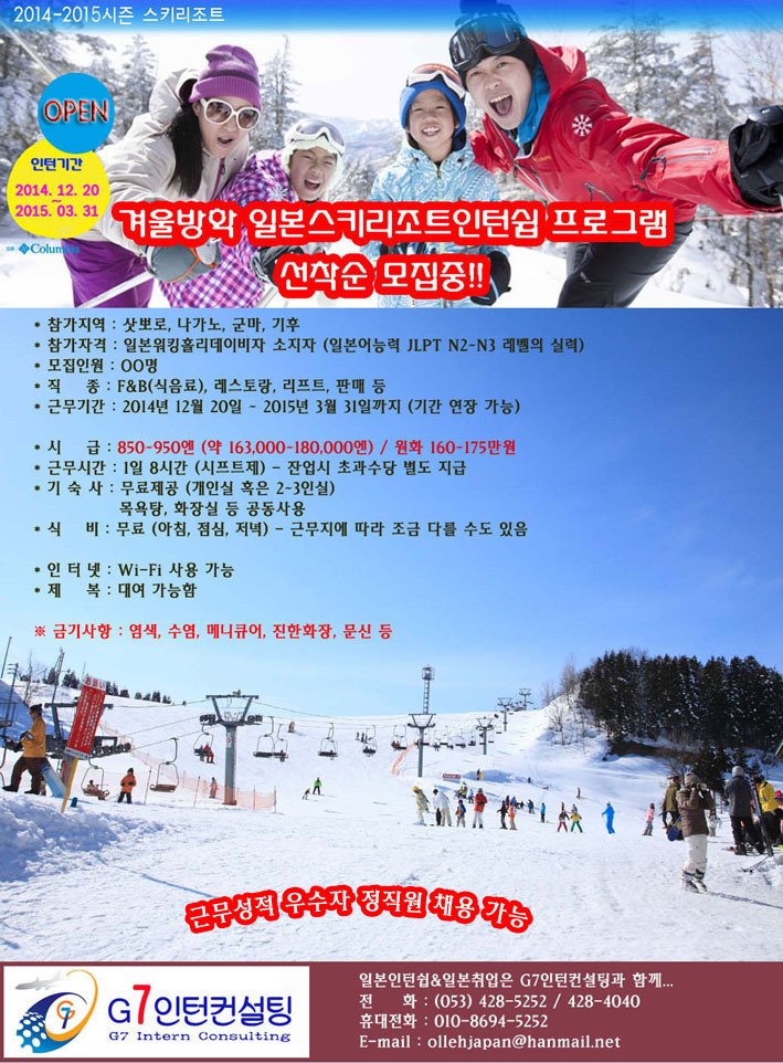 | 겨울방학 일본스키리조트인턴쉽 - 월 150만원 이상.. | anonymous | 2014-09-18 | 404 |